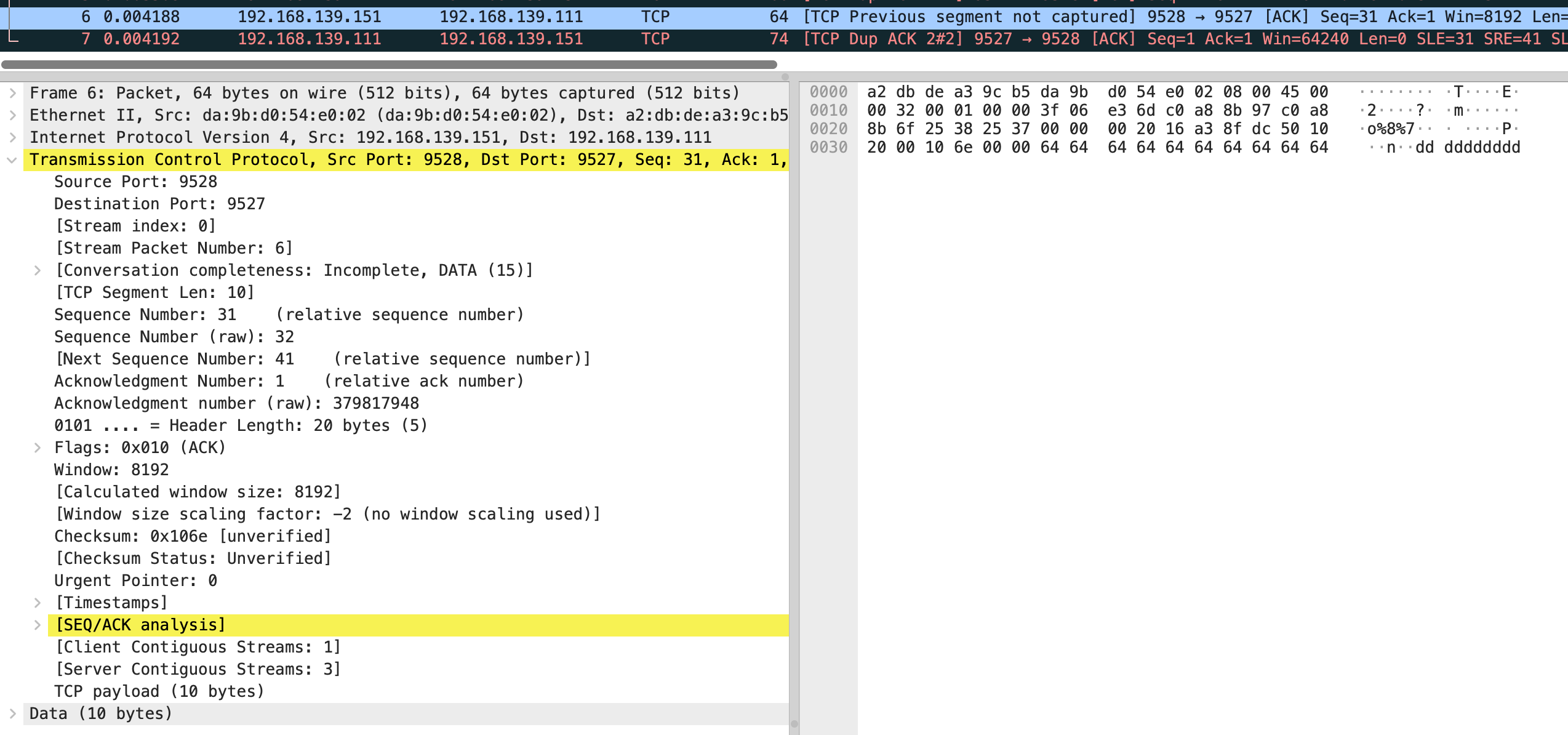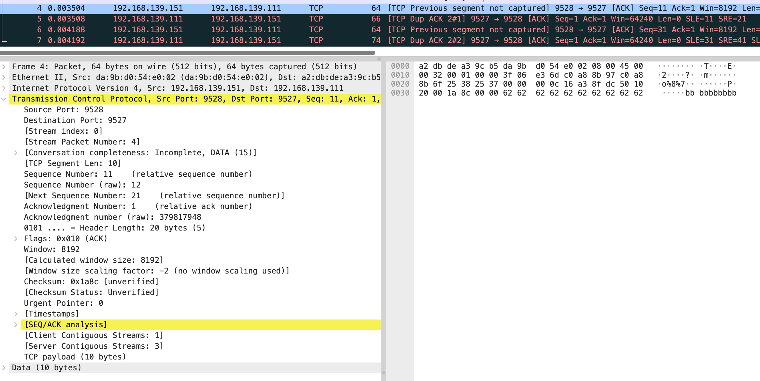 结合抓包来看,vm-2 发送了第 4 个包 是个 ack,seq number 是 11,next seq number 应该是 21,第 6 个包 seq number 32,next seq number 是 41