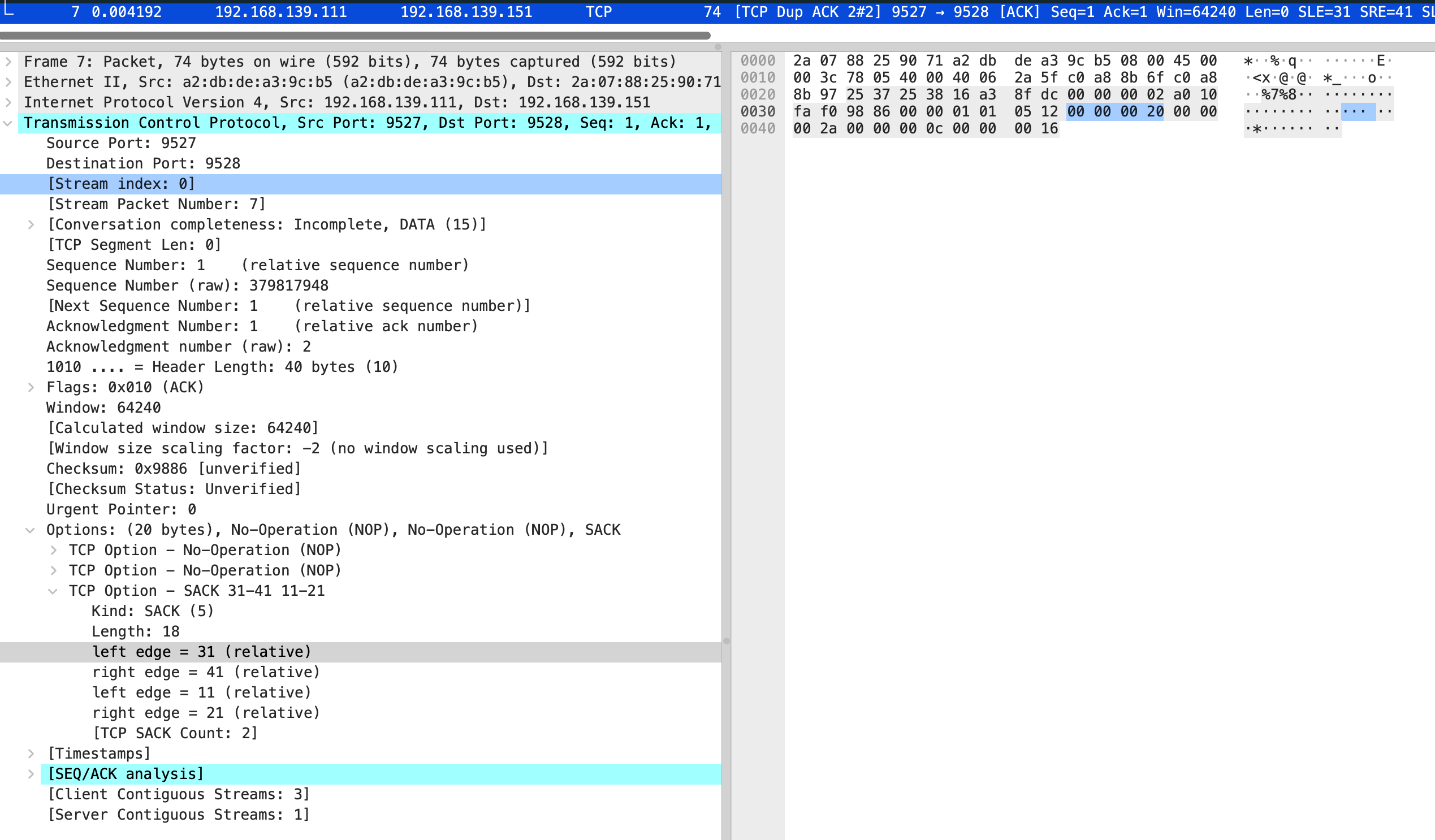确实能看到 TCP Fast Retransmission 但是和文章中确不一样,vm-1 的数据没发完 vm-2 就在发 TCP Dup ACK,在 fast 前已经发了 7 个 dup ack,根据 net.ipv4.tcp_reordering 默认是3,也就是发 3 次 dup ack 才会快速重传,一开始猜测是我本地两台虚拟机传输速度太快的原因,这里贴下 vm-1 server 和 vm-2 client 的代码