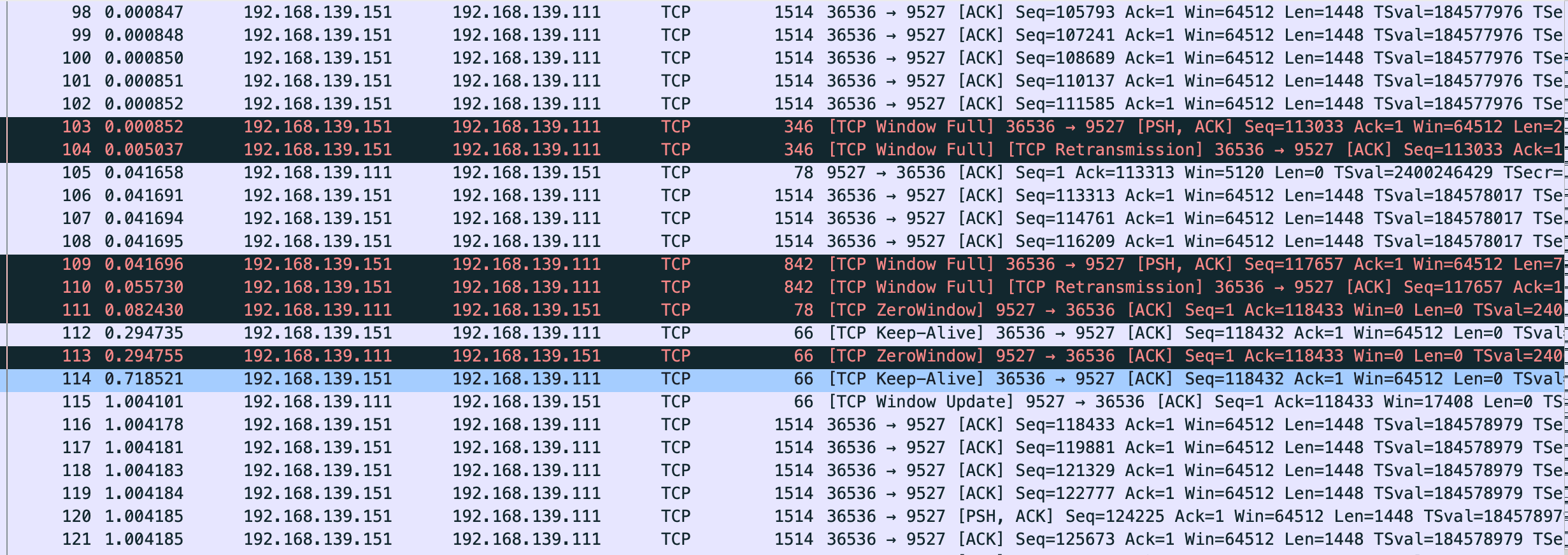 110 号包到 116 是第一段 x 轴线平了未发送数据阶段,111 是 vm-1 告诉 vm-2 我无法接收更多数据,直到 115 vm-1 发送 window update,跟 vm-2 说你可以发送数据了。