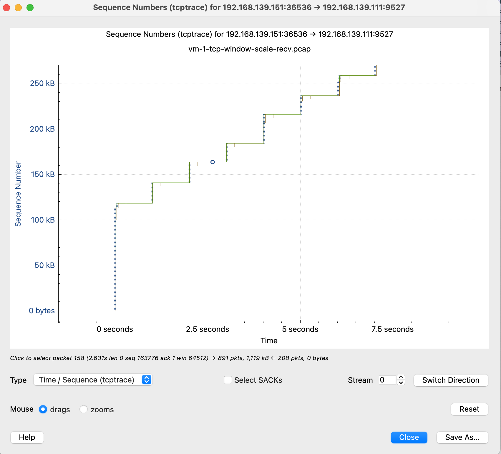 这里简单解释下这个图,X 轴是时间,Y 轴是 Sequence Number,绿色线是接收方的 window size,蓝色线是发送的包(捕获到的包),黄色的线是 ACK 过的 Sequence Number 值。那么从图上就可以看出来,每当接收方的 window size 增大的时候,立即就有包发送出去了。当 window size 为 0(线平了)的时候,发送立即就停止了。所以这个图告诉我们这个传输是接收方的瓶颈,是接收方通过 window size 的关闭对发送端进行了限流。