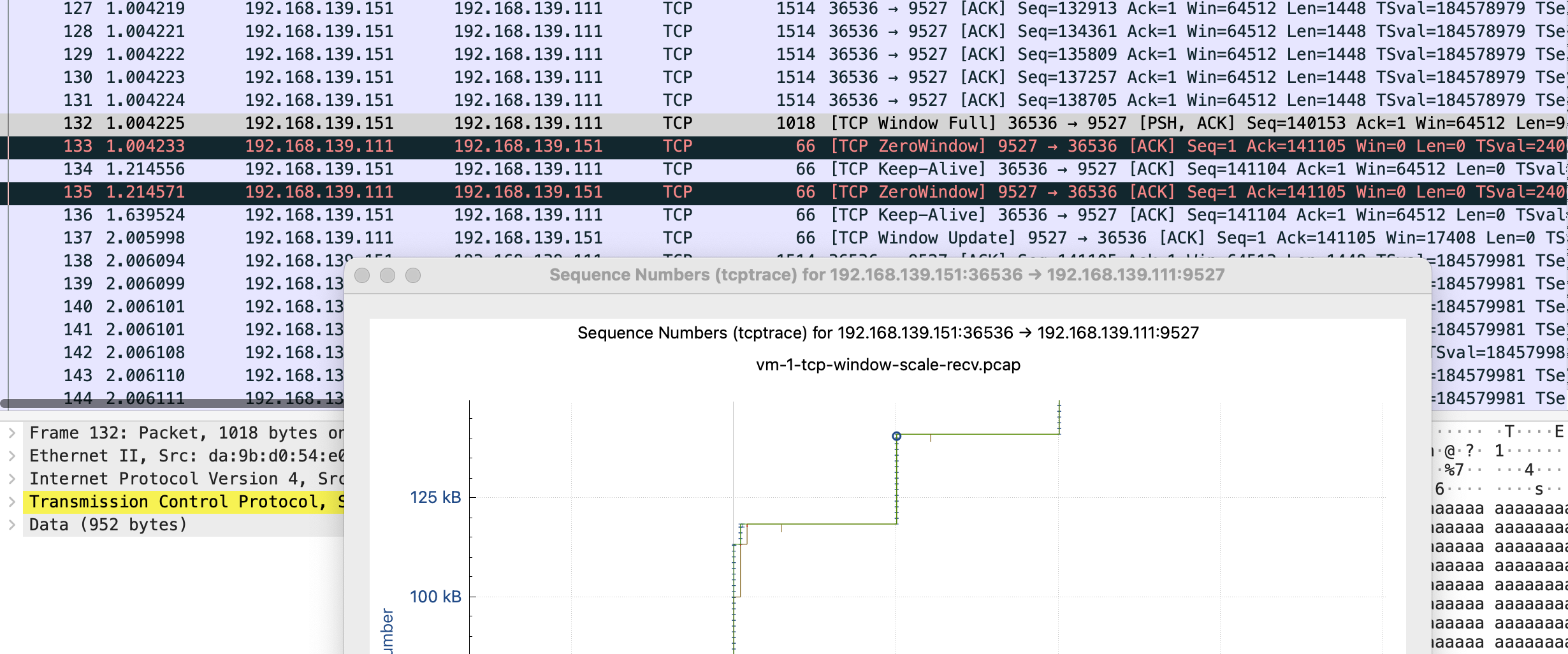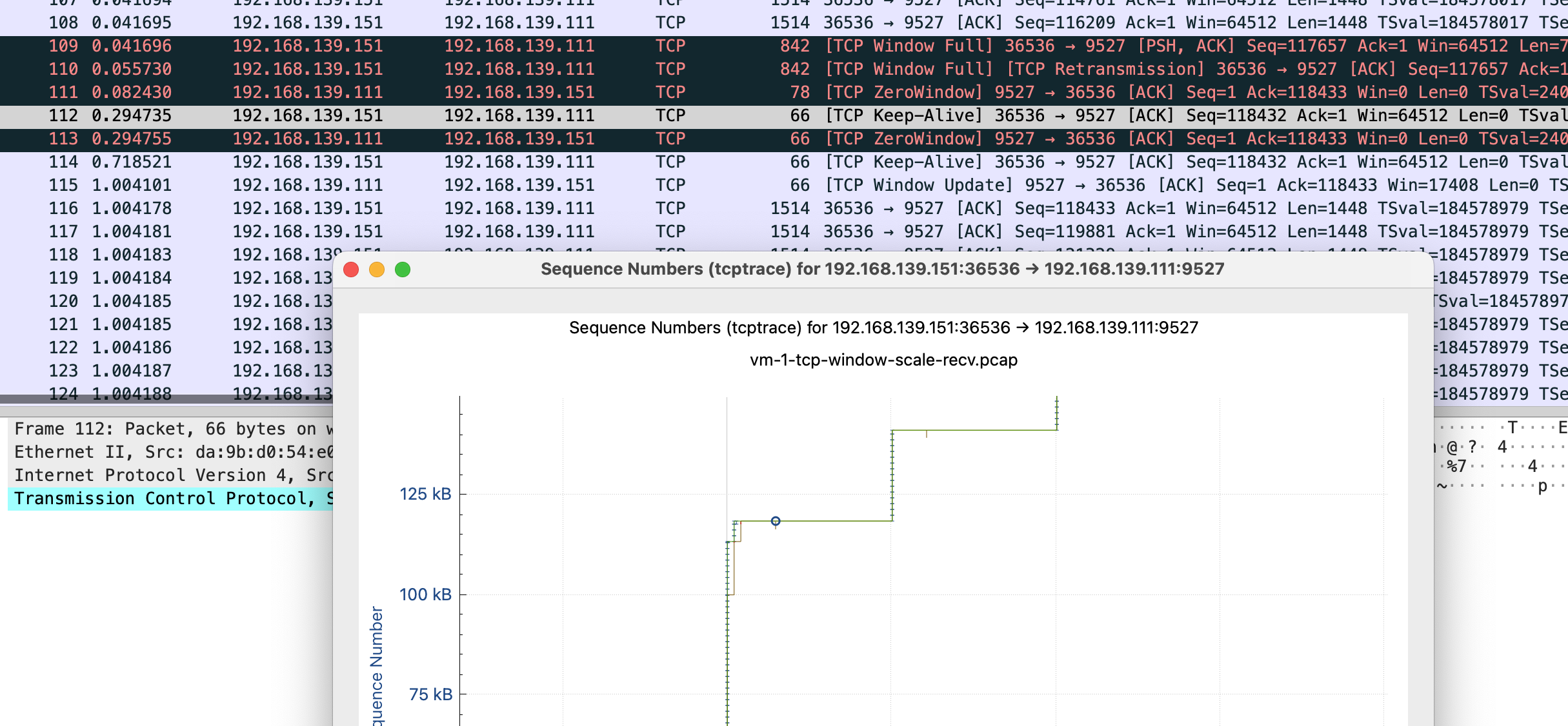 这张图鼠标可点击的点更多,比如我这里点 x 轴的点,会直接跳转到对应的包 Frame 112 是 keep-alive 下一个包 113 是 TCP ZeroWindow,从 116 到 132 都是 vm-2 给 vm-1 发送数据 代表y 轴上升的线证明有数据发送,113-116 表示 vm-1 没有窗口接收了,参照代码正是读一会停一会,换到正常业务就是服务端处理的比较慢
