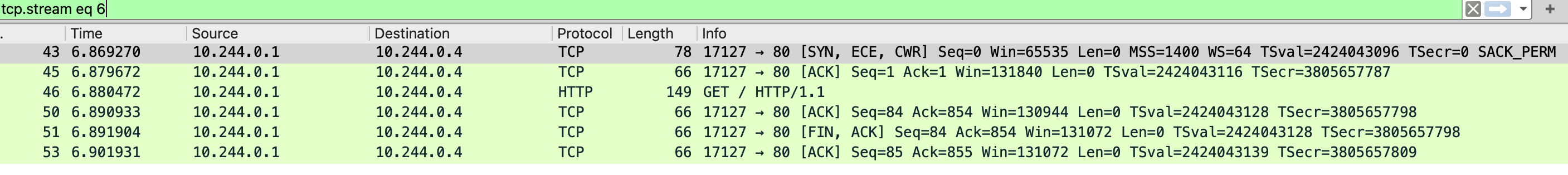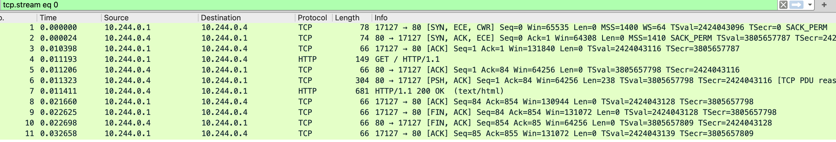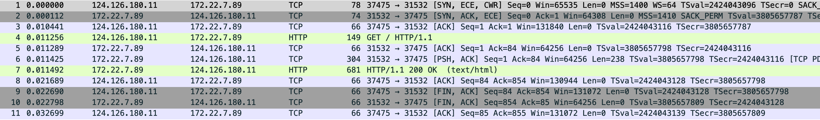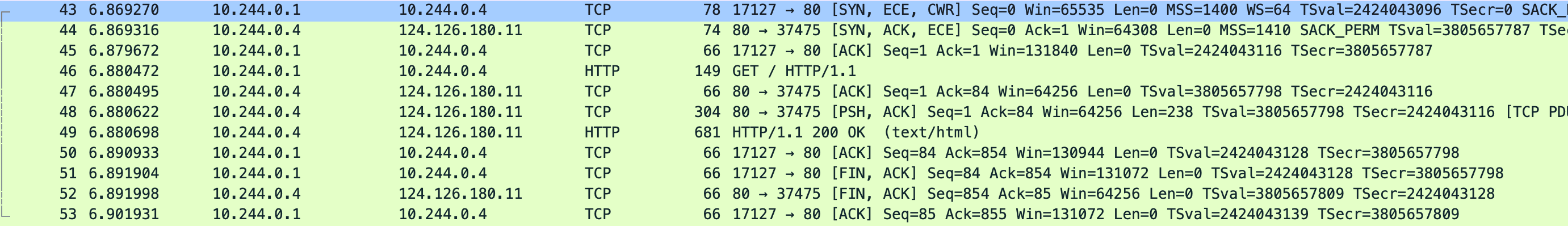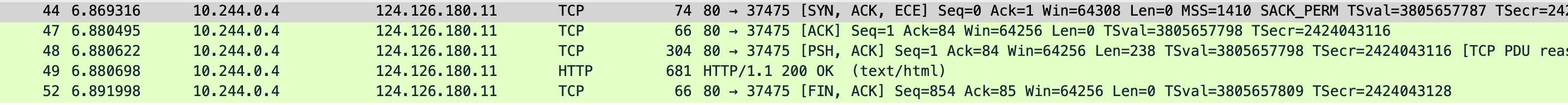 先看 eth0 抓包文件,能看到本地和主机网卡建立连接,三次握手后直接发了 GET / 请求,cni0 抓包中是 10.244.0.1 向 0.4 发送的 GET /,0.1 ip 是 cni0 网卡地址 0.4 是容器的地址,然后 0.4 直接把内容返回给本地 socket 地址也能对应上 37475,最后 nginx 中的抓包则是只和 cni0 网卡通信。