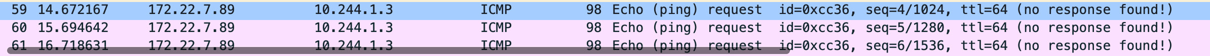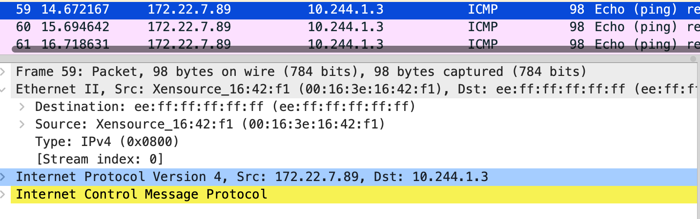 这里去 ping 10.244.1.3 另一台的机器上的 pod 发现不通,抓包下,能看到目的 mac 是 ee:ff:ff:ff:ff:ff,云上主机二层网络是不通的,ping 10.244.1.3 走的路由是 10.244.1.0 172.22.7.90 255.255.255.0 UG 0 0 0 eth0 搜索发现 host-gw-in-aliyun,通过在 vpc 自定义路由添加两条规则 本机的 pod cidr 下一跳是这台 ecs,有几个主机添加几个,之后就可以直接连通了。